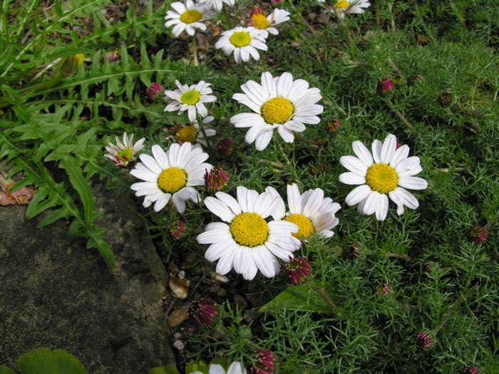 - мелкие цветы с желтой сердцевиной и белыми лепестками, обратная сторона которых имеет бордовую окраску. Растение, полученное из семян анациклюса, не вырастает выше 10 см. Это отличный почвопокровник с высокими эстетичными данными. На ночь и в дождь соцветия остаются закрытыми. Растение нуждается в большом количестве солнечного света. Для посадки рассады анациклюса подходит каменистая почва.