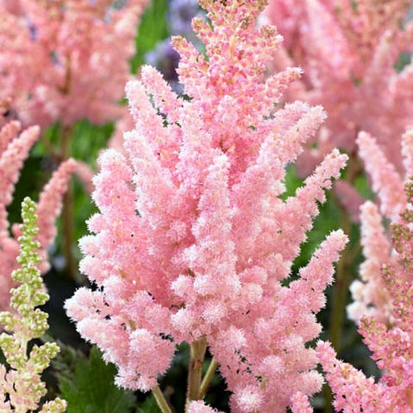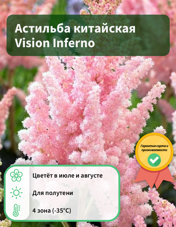 Саженцы Астильбы китайской Вижен Инферно (Vision Inferno) добавят цветнику изысканной нежности и легкости. В июле на небольших кустиках (высота не более 60 сантиметров) распускаются пирамидальные метелки бледно-розового оттенка. Крохотные цветочки в составе соцветий раскрываются по направлению снизу вверх, закрытые бутоны имеют светло-зеленый цвет. Таким образом, цветущая астильба, постепенно изменяет оттенок с зеленоватого на розовый.