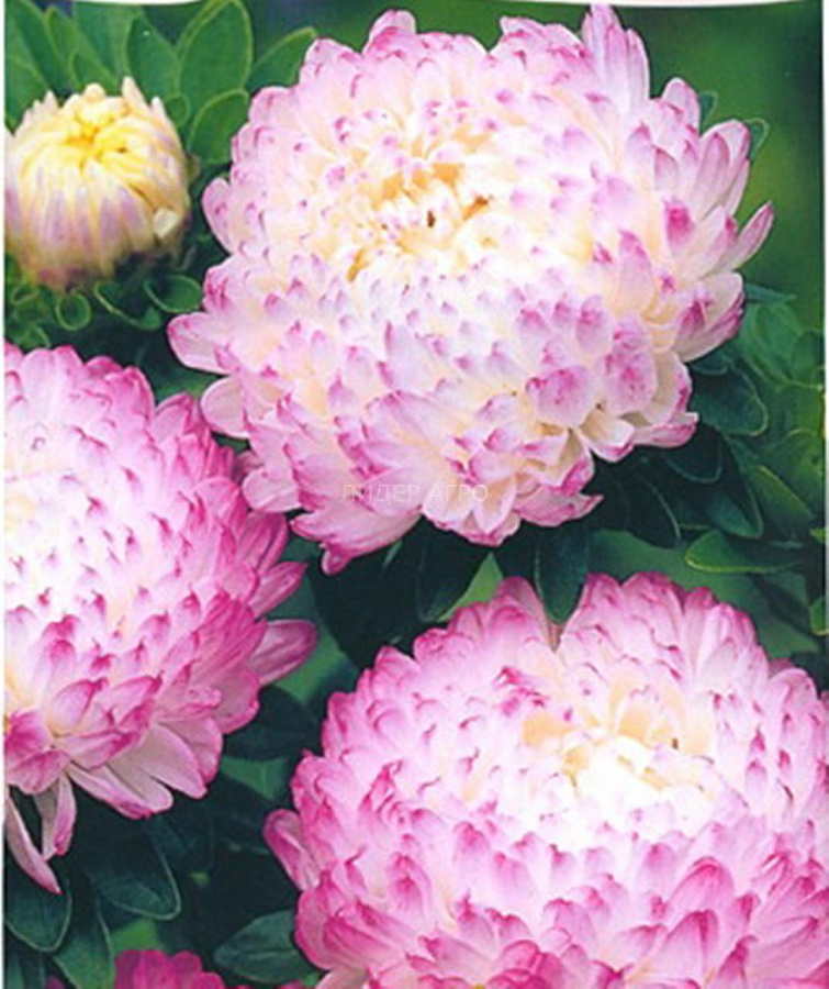 Астра пионовидная "Дюшес Роуз энд Вайт" - это великолепное растение с бело-розовыми цветками, которое поражает своей изящностью и красотой. Ее стебель достигает высоты до 70 см, а диаметр цветка составляет 8-10 см. Листья этой астры имеют уникальную форму и ярко-зеленый оттенок, что делает растение еще более привлекательным.