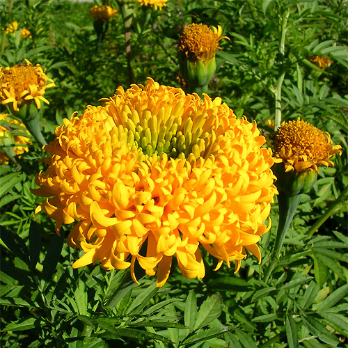 Бархатцы прямостоячие спун золотые - это великолепное растение с золотистыми цветками, которое порадует вас своей красотой и изяществом. Этот сорт бархатцев имеет прямостоячие стебли, достигающие высоты до 40 см, что делает его идеальным выбором для групповых посадок. Цветение начинается уже в марте и продолжается до июля, радуя глаз своими яркими золотистыми цветками.