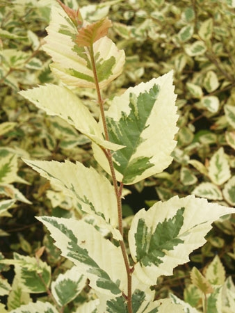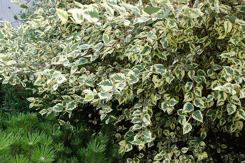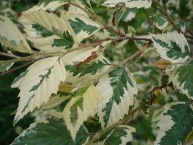Сорт уникален не только своей карликовостью, но и необычной листвой пестрого окраса: зеленый тон с белой каймой. Цветет в мае золотистыми «сережками», длиной до 15 сантиметров.