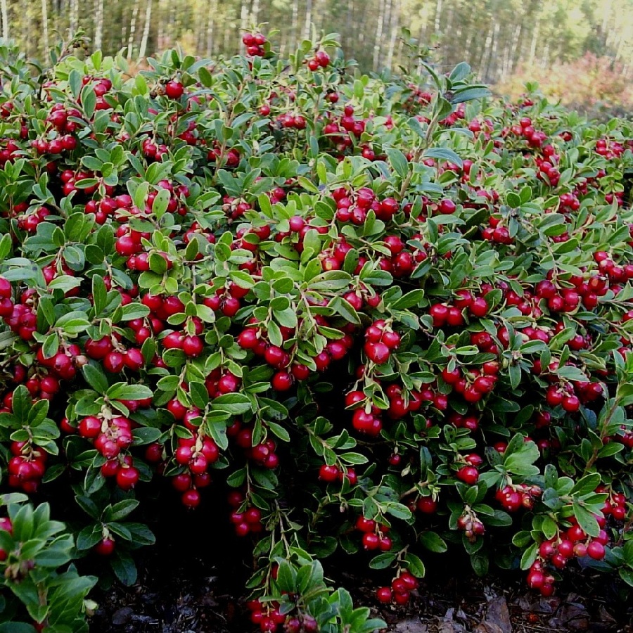 Рассада брусники Коралл вырастает небольшим, аккуратным кустиком около 40 см в высоту. Листва округлой, немного продолговатой формы, кожистая, глянцевая и темно-зеленого тона. Цветет небольшими, розово-белыми, колокольчатыми цветочками, которые собраны в густые соцветия. Преимущества брусники Коралл: