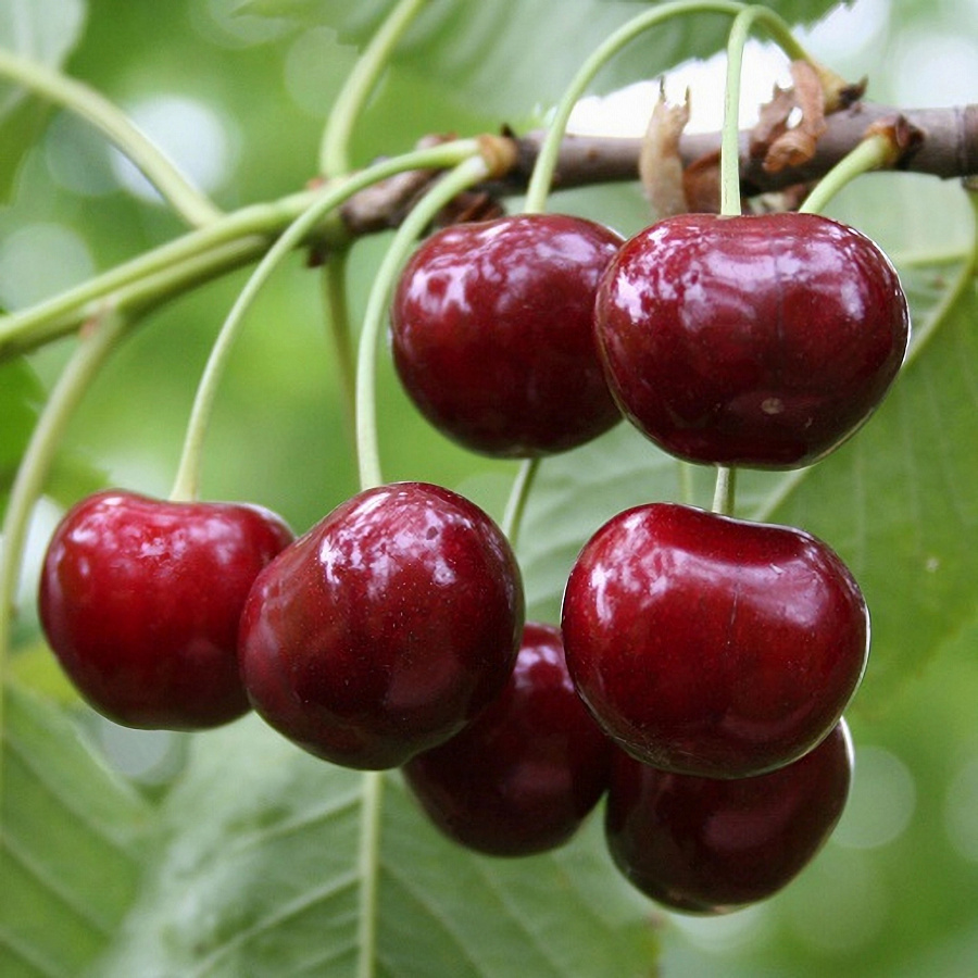 Саженцы черешни Ипуть прекрасно растут деревом средней облиственности и рослости (4-5 м) с широкой кроной. Крупномер плодоносит на 4-5 год от посадки, средняя регулярная урожайность с дерева до 25-50 кг в зависимости от условий и агротехники.. Ягоды собраны в букеты по 3-5 шт,. округлые крупные (5-9 г); вызревая, становятся темно-бордового цвета, сладкого привкуса с тонкой горчинкой. Содержит массу полезных веществ: йод, железо, пектин, витамины С, РР, А и группы В. Хороша в свежем виде и для джемов, компотов, соков.