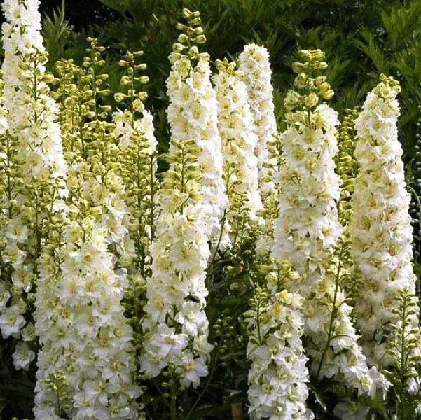 Рассада дельфиниума культурного Джайант Галахэд вырастает до двух метров, имеет длинные цветоносы, которые в сезон цветения (с середины июня до начала осени) покрываются крупными белоснежными цветками, которые образуют пирамидальные соцветия-свечки.