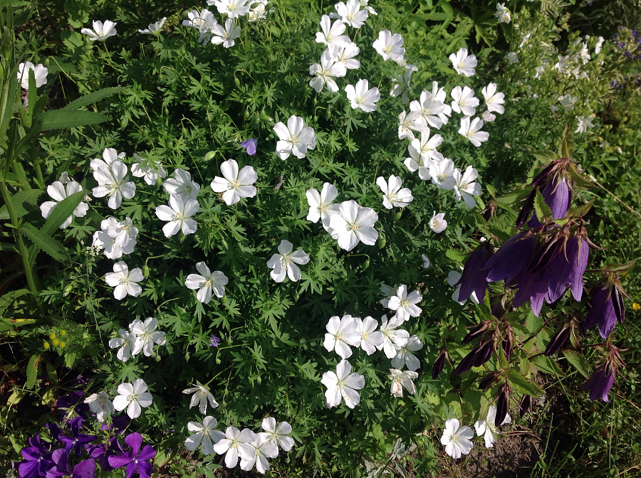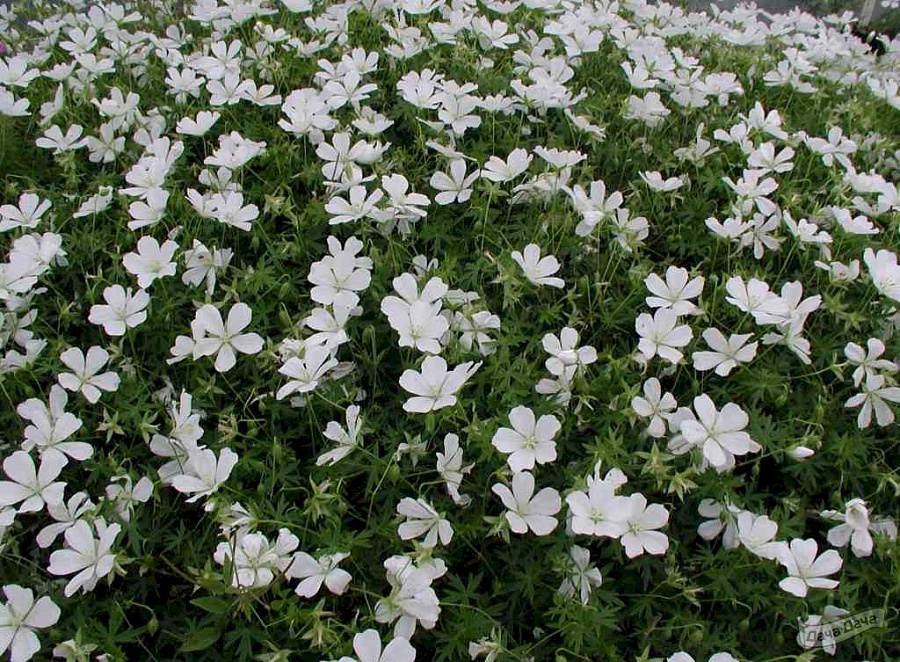 Саженцы герани кроваво-красной Альбум (Geranium sanquineum Album) разрастаясь, образуют пышные кустики красивой сферической формы, усыпанной нежными белыми цветочками. Растение достигает в высоту от 20 до 30 сантиметров, в ширину до 50 сантиметров. В осенний период листья и стебли приобретают ярко-красный оттенок. Цветочки белые, с прожилками, диаметром 2-3,5 сантиметров. И листья, и цветы обладают ярким характерным ароматом. Сорт устойчивый, хорошо переносит суровые зимы и засуху, практически не подвержен болезням и поражениям вредителями. На одном месте может расти до 15 лет.