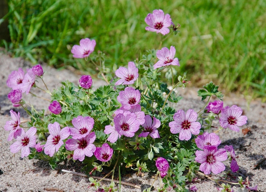 Рассада герани пепельной Ballerina (Балерина) - морозостойкий сорт, прекрасное украшение любого рокария. Кустик формируется изящный, не высокорослый (до 15 см) с декоративными листиками и нежными чашеподобными цветками диаметром до 3 см. Расцветка розовая (пепельно-розовой), с четкими лиловыми прожилками. Особенно эффектно смотрится в сочетании камешков и гальки. Цветет пышно и продолжительно, начиная с июля. Можно размножать семенами.