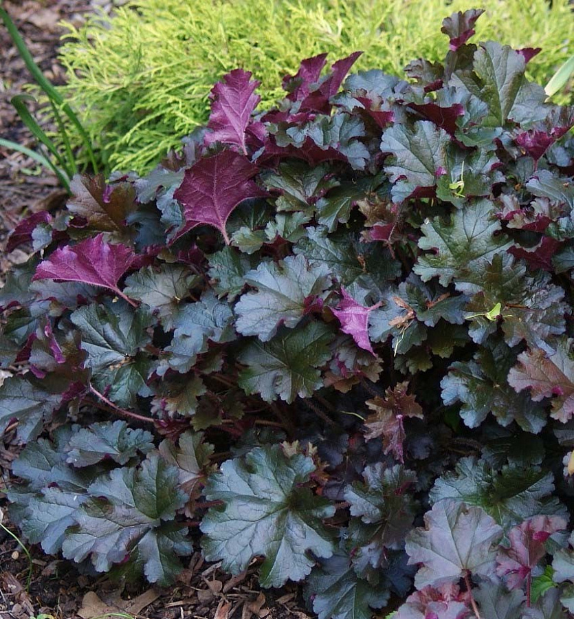 Рассада гейхеры Принц (Prince) завораживает цветом своих листиков, которые имеют насыщенно-красный, пурпурный окрас. Благодаря волнистым краям листвы, куст выглядит пышным. В июле расцветает белыми цветочками, которые контрастно выделяются на фоне листьев. Достоинства: