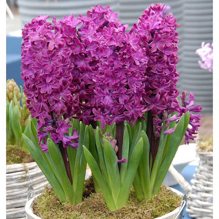 Луковицы гиацинта крупноцветкового Бродвей (Broadway) весной подарят ароматные сиреневые кисти из нежных кудрявых цветков. Эффектные растения с плотными стеблями, густо усеянными яркими соцветиями, напоминают прямостоящие кисти сирени. Прикорневая листва изумрудного оттенка увядает и отмирает после цветения и наступает пора выкапывать луковицы.