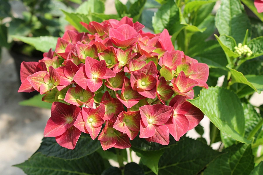 Гортензия крупнолистовая "Грин Шадоу" - это великолепное растение с темно-красными цветками, украшенными зелеными оттенками. Ее ярко-зеленая листва радует глаз как весной, так и осенью. Сорт отличается диаметром до 25 см и формой листьев, которая придает растению особый шарм. Гортензия предпочитает солнечные и полутенистые места для посадки, а также дренированные богатые почвы.