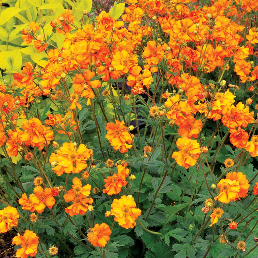 Саженцы гравилата чилийского Фаерболл (Geum chiloense Fireball) своим пышным цветением и ярким окрасом украсят клумбу, цветник и станут акцентом. Высота стебля – до 45-50 сантиметров. Листья темно-зеленые, опушенные. Цветки яркие, оранжево-желтые, полумахровые, состоят из широких лепестков, по центру расположены множественные тонкие тычинки. Период цветения длительный, с мая по октябрь. Гравилат используют как лекарственное растение и в качестве пряности. Растение предпочитает хорошо освещенные места с легким затенением. Предпочитает умеренно-влажные, рыхлые почвы. Полив – не частый, по мере подсыхания почвы.