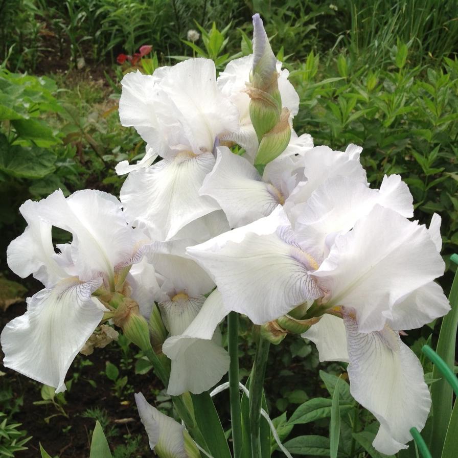 - высокий уровень морозоустойчивости. Цветок однотонный белый, с легким голубоватым оттенком, бородка на нижних лепестках желтая. Лучше цветет на солнечных участках с умеренно влажной почвой. Ирис германский Английский Коттедж часто выращивается на срез в букеты и для цветочных декораций. Семенами размножается трудно.