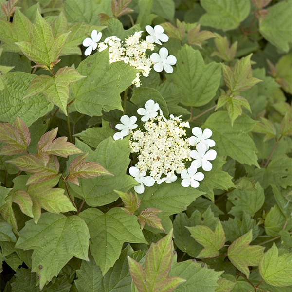 - Калина компактная – карликовая разновидность Калины обыкновенной; это кустарник высотой 0,5-0,8 м, с густой кроной из 3-5-лопастных листьев, цветущий в конце мая бело-розовыми цветами с характерным запахом;