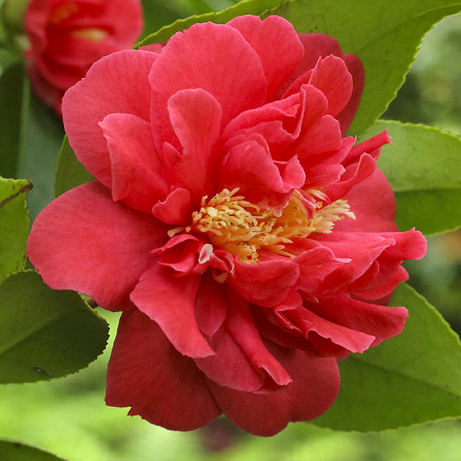 Камелия японская блад оф чайна - это великолепное комнатное растение, которое поразит вас своей красотой и изысканностью. Ее полумахровые цветки ярко-красного цвета с пучком желтых тычинок привлекут внимание каждого, кто войдет в ваш дом. Это растение имеет темно-зеленую листву, которая сохраняет свою красоту на протяжении всего года.