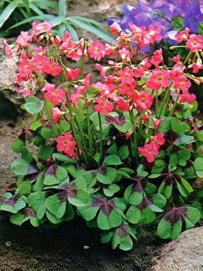 Луковицы кислицы гибридной Айрон Кросс (Clarkia, Iron Cross) высаживают в групповых и одиночных посадках. Высота взрослого растения не превышает 15-30 сантиметров. Компактные размеры делают его незаменимым для некоторых областей в саду — участка возле водоема альпинария, передней части цветника. Форма листьев — трехлопастная. Окрас не менее оригинальный — зеленый с пятнами бордового цвета в центре. Ночью или в пасмурный день листовые пластины складываются и поникают. В мае кислица распускается небольшими розовыми цветами, собранными в зонтиковидные соцветия, цветет все лето,оживляя клумбу яркими красками.