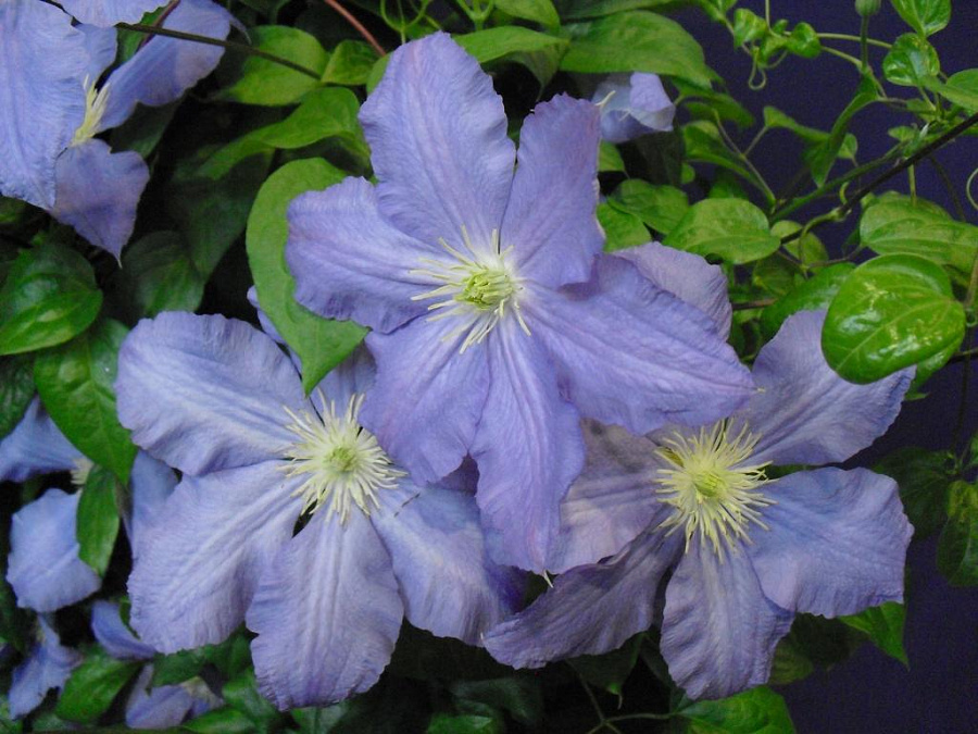 Цветёт на побегах текущего года. Цветение начинается в июне и особенно сильным становится в августе. Цветки очень крупные, диаметром 15…20 см, плоские. Чашелистиков от 4 до 7, они широкоовальные с загнутым заостренным кончиком и выраженной средней полосой, на которой видны три бороздки. Окраска чашелистиков светло-сиреневая или фиолетово-голубая, средняя полоса обычно светлее. На кончике чашелистика может быть желтоватый или красноватый мазок. Тычиночные нити кремовые, пыльники светло-желтые.