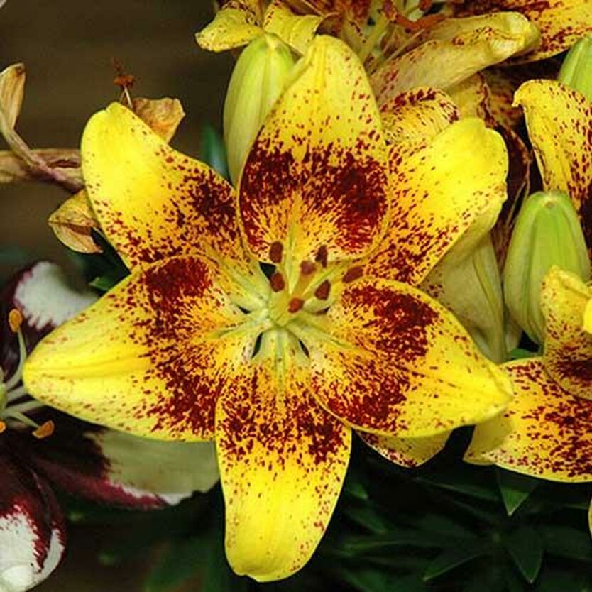 Лилия азиатская горшечная "Тайни Наггет" - это настоящая жемчужина среди садовых растений. Ее стебель достигает высоты до 45 см, а цветки радуют глаз желтым оттенком с густым бордовым крапом. Листья лилии имеют уникальную форму, что делает это растение еще более привлекательным.