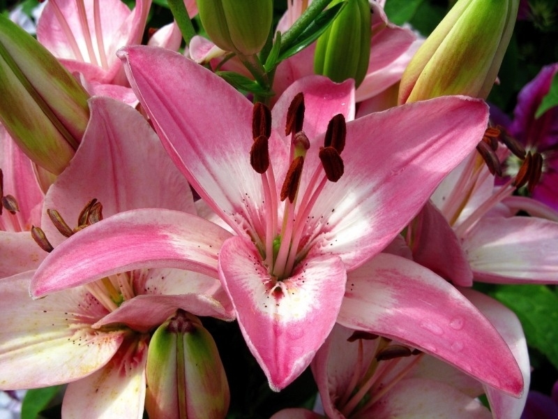 • Окраска цветка : Цветки плотной фактуры, розовые, кончики лепестков более насыщенные, центр белый с темно-розовым крапом; в горле ярко-розовые; направлены вверх