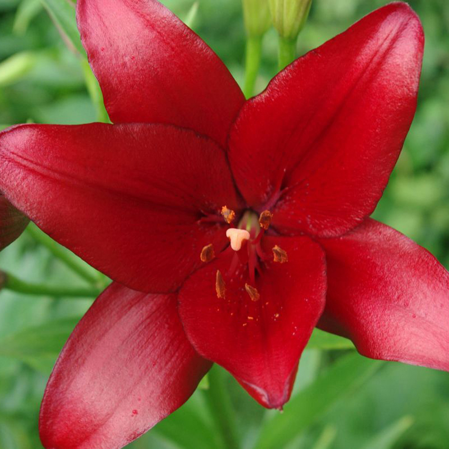 Период цветения приходится на вторую половину июля. Бутоны крупные, чуть склонены вниз. Цветки насыщенного красного, свекольного оттенка, блестящие. Тычинки горчичные, малозаметные. Сорт предпочитает расти на солнце или в легкой полутени. Лилия морозостойкая, в жару требуется полив.