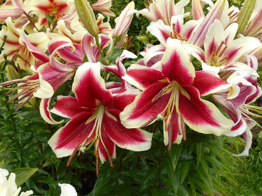Лилия от-гибрид Flashpoint - это великолепное растение с темно-розово-винными цветками, украшенными кремово-белой каймой и желто-зеленой "звездочкой" в центре. Ее широкие, волнистые лепестки создают неповторимый вид, который поражает своей красотой. Высота растения достигает 120 см, а размер цветка составляет 15-18 см, что делает его заметным акцентом в саду.
