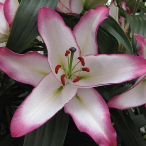 Саженцы и рассада восточной Лилии Зе Эдж (Lilium oriental hybrids The Edge) – неприхотливый посадочный материал. Со временем на рыхлых плодородных почвах и регулярном поливе он превращается в настоящую восточную красавицу, крупные цветки которой пестрят экзотическими красками. На белоснежном фоне каждого лепестка прослеживается зеленоватая жилка у основания, а края лепестков оформлены в ярко-розовом оттенке. При высадке таких многолетников высотой порядка 90-110 см необходимо подумать какие растения использовать в качестве их фона, а какие расположить рядом. Здесь может быть множество вариаций, поэтому смело экспериментируйте.