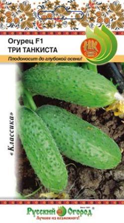 Семена огурцов "Три Танкиста F1" — сорт, который обладает устойчивостью к вирусу огуречной мозаики, мучнистой росе, толерантен к ложной мучнистой росе и корневым гнилям. Индетерминантное, сильнорослое, со средней ветвистостью растение вступает в плодоношение на 40-43 день после полных всходов. Плоды веретеновидной формы, слаборебристые, зеленые с короткими полосами, бугорки среднего размера, частые. присутствует опушение белого цвета. Масса достигает 90-110 грамм, длина 10-12 см. Вкусовые качества отменные как в свежем, так и консервированном виде.