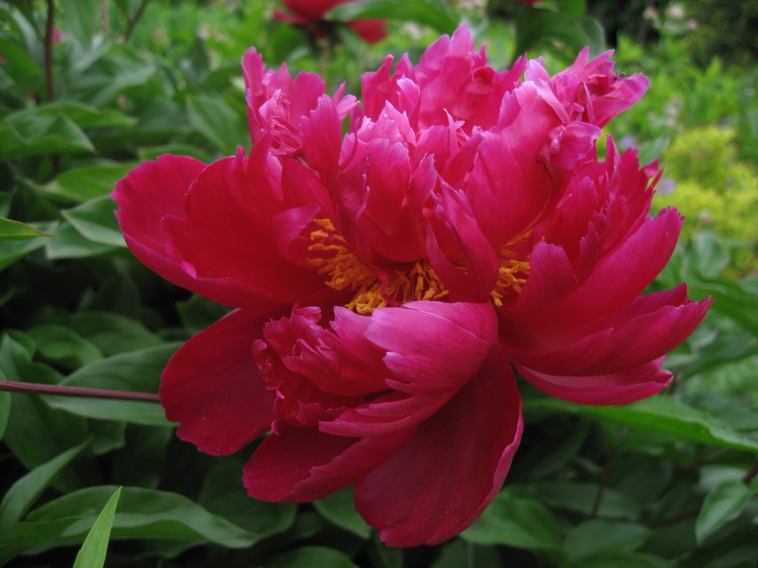 Саженцы пиона древовидного Пурпурный феникс (Paeonia Suffruticosa) подходят для групповых посадок, но лучше всего смотрятся в одиночных. Кусты раскидистые, стебли высотой до 1,2 метров. Листва пышная. Растение морозостойкое, переносит холода до минус 25 градусов. Пион предпочитает солнечные участки. Цветки роскошного бордового оттенка, соцветия махрового типа. В середине лепестки маленькие и волнистые. Диаметр цветков от 20 до 25 сантиметров. Зацветает пион в конце мае, большинство бутонов распускаются в одно время. Продолжительность цветения – около двух недель.