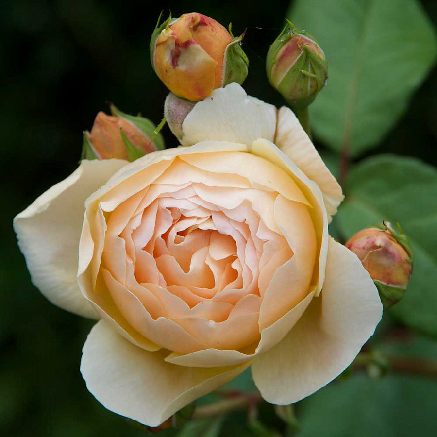 Саженцы розы английская кустовая Джуд Обскур (Jude the Obscure): Волнующая махровая роза с мягкими абрикосово-медовыми цветами с более светлыми желтыми лепестками ближе к внешней стороне соцветий. Это энергичное растение с сильными изогнутыми главными ветвями, на которых растут стебли с крупными цветами. Обильно цветущая роза, свободно цветет все лето и осень. Уникальность данного сорта заключается в его аромате, это самая важная деталь розы, она получила награды за удивительно сильный фруктово-цитрусовый аромат которая действительно отличает ее от других сортов. Эта роза остается большой любимицей многих садоводов. Характерные особенности растения: