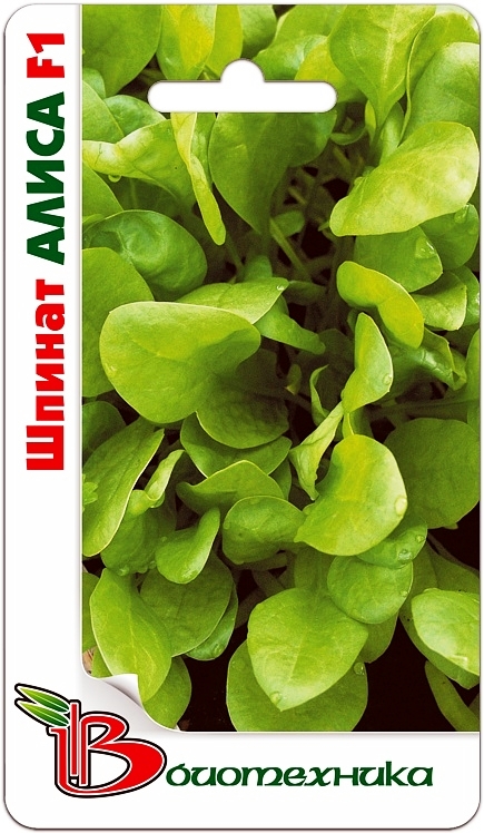 Семена шпината "Алиса F1" (Alice F1) высевают на постоянное место сразу, как только можно начать полевые работы. Место выбирают хорошо освещенное с плодородной почвой. После появления всходов проводят прореживание, оставляя расстояния между растениями 7-10 см. Начинать сбор урожая можно уже спустя 30-32 дня после появления всходов. Сорт характеризуется средне компактной розеткой и листьями овальной формы со слегка морщинистой поверхностью. Растение богато на полезные минеральные вещества, витамины, белок и употребляется в свежем виде и кулинарии. Очень важным достоинством гибрида Алиса F1 является резистентность к трем расам (А,В,С) ложной мучнистой росы - основной болезни шпината.