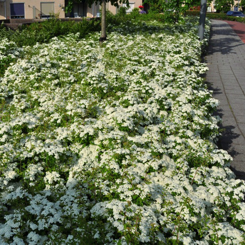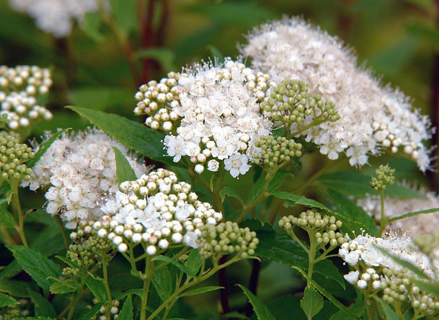Неприхотливые саженцы спиреи Альбифлора будут отлично смотреться в сочетании с хвойными кустарниками и спиреями другой расцветки.