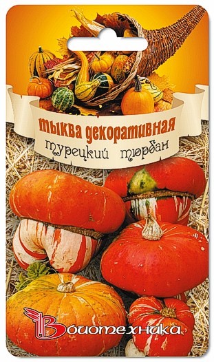 Семена тыквы "Турецкий тюрбан" (Turetckij tiurban) позволяют вырастить на грядках уникальные плоды, отличающие очень интересной формой. Посев на рассаду осуществляют в марте – апреле, а высадку на постоянное место – в мае. Сорт позднеспелый. Урожай можно собирать с середины сентября. Плоды состоят будто из двух частей: одна поменьше окрашена полосками оранжевого, белого и зеленого цвета, а вторая – крупнее и представлена насыщенно-оранжевым оттенком. Используют урожай в декоративных целях и в пищу. Мякоть обладает насыщенным ароматом, окрашена в оранжевый цвет, толстая.